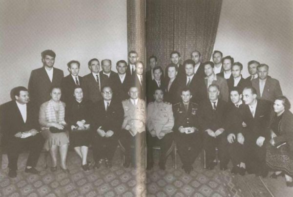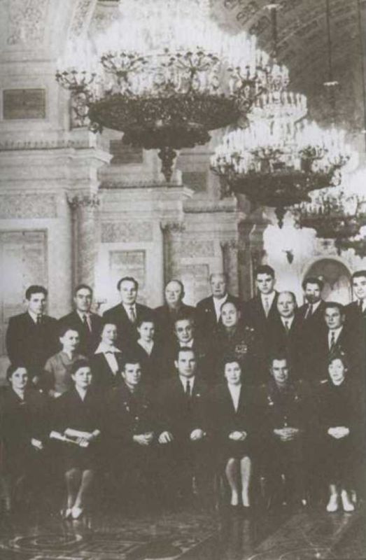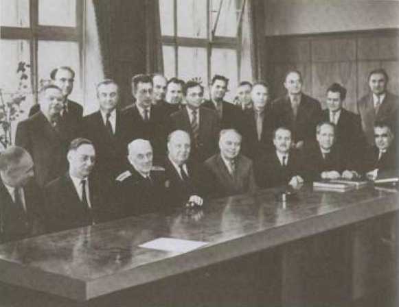 А. А. Расплетин (стоит четвертый слева) среди делегатов партийной организации КБ-1 (на обороте фотографии автографы С. М. Буденного, А. И. Еременко и Ю. А. Гагарина).