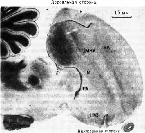 Рис. 10.2. Разрез переднего мозга цыпленка. На этой микрофотографии показано расположение IMHV и LPO. Другие отделы мозга: НА — hyperstriatum accessorium; N — neostriatum; PA — paleostriatum augmentatum. Темноокрашенная древовидная структура слева вверху — мозжечок.