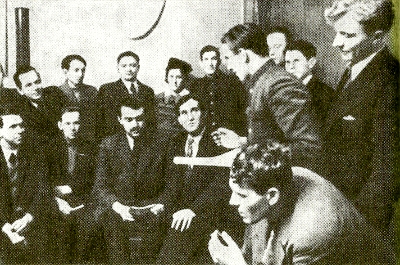 Участники I совещания молодых писателей: М. Луконин, В. Урин, В. Захарченко, А. Межиров, В. Тушнова, С. Гудзенко, П. Антокольский (руководитель семинара). Москва. 1947 г.