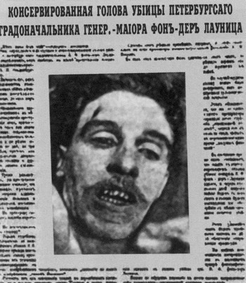 Фотография заспиртованной головы Евгения Кудрявцева, убийцы фон дер Лауница, опубликованная в газете для опознания