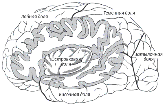 Рисунок 5. Левое полушарие мозга, вид сбоку, доли головного мозга подписаны. Некоторые части мозга удалены, чтобы показать островковую долю – заднюю часть за височной долей