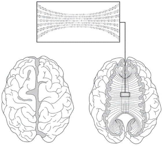 Рисунок 6. Два мозга, вид сверху. Справа мозг показан в разрезе, так что мы можем увидеть мозолистое тело. Мозолистое тело – мост, соединяющий правое и левое полушария