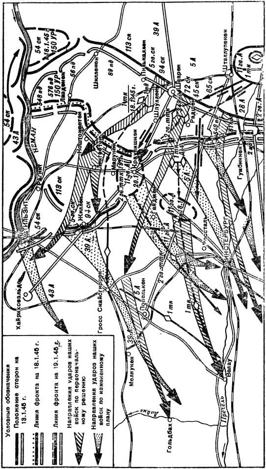 17 января 1945 года 5-й гвардейский и 94-й стрелковый корпуса сильным ударом прорвали гумбинненский оборонительный рубеж на всю его глубину и уже к исходу дня, громя и преследуя противника, повернули на северо-запад. В нарастающем темпе развертывалось наступление 113-го корпуса. Учитывая обстановку, Черняховский незамедлительно использовал успех 39-й армии. На участке ее прорыва он ввел свой второй эшелон: 11-ю гвардейскую армию генерала К. Н. Галицкого и два танковых корпуса — А. С. Бурдейного и В. В. Буткова. Корпус Буткова прибыл к нам, когда мы штурмом взяли Хенснишкенен. В это время был получен новый приказ Черняховского. Успех 39-й армии позволил командующему фронтом частично изменить первоначальное решение.