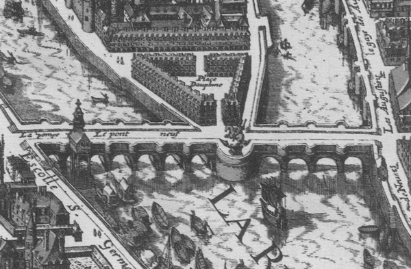 В 1607 году Новый мост соединил берега Сены с островом Сите, на котором появилась площадь Дофин. Карта 1615 г.