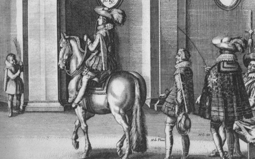 Плювинель обучает юного Людовика верховой езде. Гравюра К. ван де Па-мл. из книги А. Плювинеля «Наставление королю в искусстве верховой езды». 1625 г.