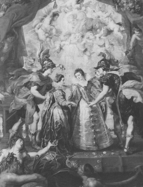 «Обмен принцессами». Испанская принцесса Анна Австрийская, выданная замуж за Людовика XIII, и его сестра Елизавета, ставшая женой испанского инфанта, в окружении античных божеств. П. Рубенс. 1622–1625 гг.