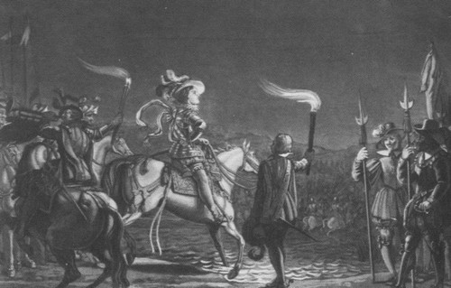 Людовик XIII проникает в полночь на остров Рие 16 апреля 1622 года. Гравюра Э. Оккара. 1816 г.
