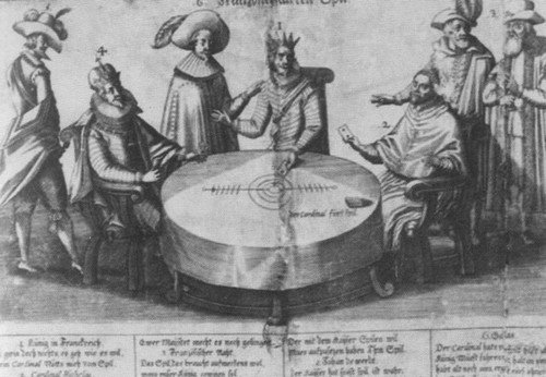 Император Священной Римской империи Фердинанд II, Людовик XIII и Ришелье играют в карты. Карикатура 1635 г.