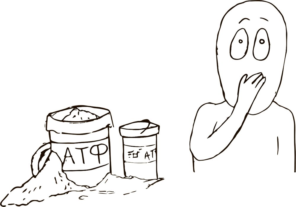Существует тесная связь между поглощением пищи и дыханием. Оба эти процесса преследуют одну и ту же цель: синтез молекул АТФ во всех клетках тела. АТФ, или аденозинтрифосфорная кислота, — это универсальная клеточная батарейка, она обеспечивает энергией абсолютно все процессы, которые с нами происходят. Нейроны гоняют туда-сюда электрические импульсы, сперматозоиды крутят хвостиками, мышцы сокращаются, раны заживают — что бы ни происходило в организме, для этого нужна энергия в страшных количествах. Все клетки тела постоянно занимаются превращением молекул-предшественников в АТФ. Это превращение требует чудовищно длинной и сложной последовательности биохимических реакций, но суммарное уравнение выглядит безобидно: