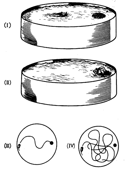 Рис. 9.5. Лабиринт Морриса. В этом тесте крысу помещают в чан с замутненной водой (I), где она учится находить находящуюся под водой площадку (II). После нескольких сеансов обучения крыса плывет сразу по направлению к площадке (III). Однако животные с поврежденным гиппокампом или после нарушения памяти химическими средствами плавает беспорядочно и лишь случайно находит площадку, как будто раньше оно не обучалось этому (IV).