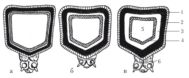 Схематический поперечный разрез тела молочной (а), шерстной (б) и мясной (в) овец: 1 – кожа; 2 – подкожная клетчатка; 3 – мышечная ткань; 4 – костная ткань; 5 – внутренние органы; 6 – вымя