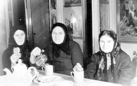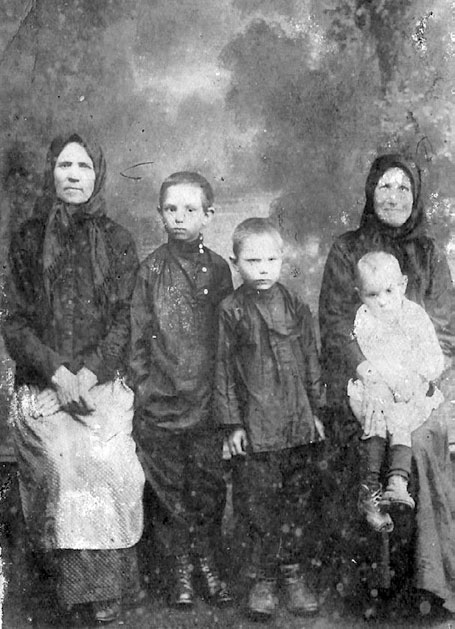 Бабушка Прасковья, старший брат батюшки Серафим, Павел (в будущем иеросхимонах Нифонт), на коленях у бабушки Марфы Петровны сестра батюшки Раиса (в будущем монахиня Римма), 1932 г.