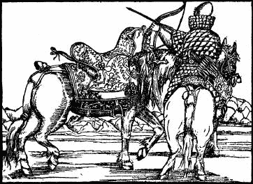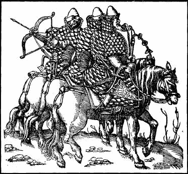 Мы воспроизводимъ гравюры, изображающія русскихъ всадниковъ и ихъ вооруженіе. Вооруженіе это, говоритъ Герберштейнъ, «состоитъ обыкновенно изъ лука, стр?лъ, топора и палки врод? булавы, именуемой по русски кистенемъ. Саблю употребляютъ богат?йшіе и благородн?йшіе. Длинные кинжалы висятъ на подобіе ножей и бываютъ такъ запрятаны въ ножны, что едва можно прикоснуться къ верхней части рукоятки и схватить ее въ случа? нужды. Равнымъ образомъ употребляютъ длинный поводъ, на конц? разр?занный, и привязываютъ его на палецъ л?вой руки для того, чтобы можно было брать лукъ и, оставивъ узду, употреблять его въ д?ло. Хотя въ одно и то же время они держатъ въ рукахъ узду, лукъ, саблю, стр?лу и плеть, однако, искусно и безъ всякаго затрудненія управляются съ ними. Н?которые изъ знатныхъ употребляютъ латы, кольчугу, искусно сд?ланную будто изъ чешуи, и поручи; весьма немногіе им?ютъ шлемъ, заостренный кверху и съ украшенной верхушкой. Н?которые им?ютъ одежду, толсто подбитую для защиты отъ ударовъ. Употребляютъ также пики».
