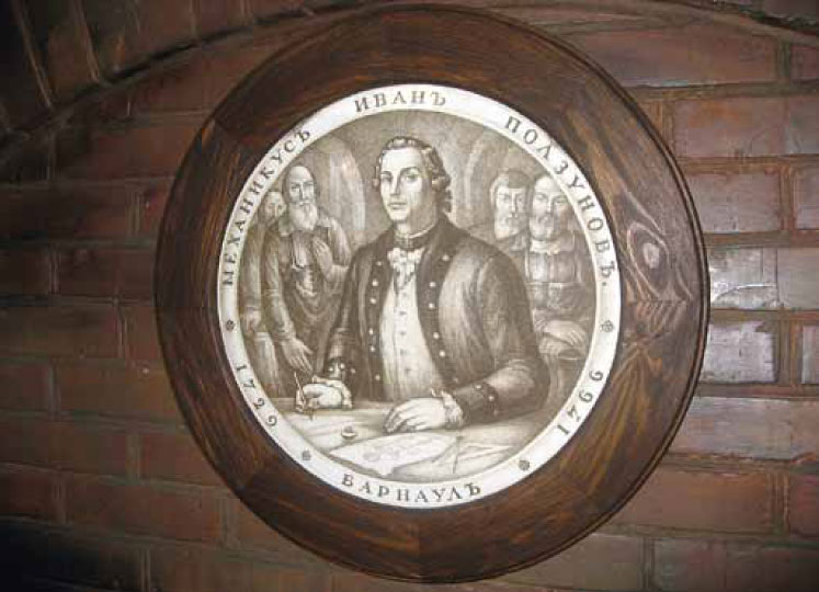 Портрет Ивана Ползунова. Надпись гласит: «Механикусъ Иванъ Ползуновъ. 1729–1766. Барнаулъ».