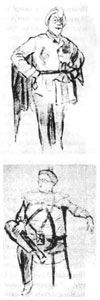 Карандашные наброски, сделанные замечательным художником В.А.Фаворским еще до войны на репетициях и представлениях "Принцессы Турандот": сверху – блистательный комик Л.Н.Горюнов в роли Труффальдино, внизу – Б.В.Щукин в роли Тартальи.
