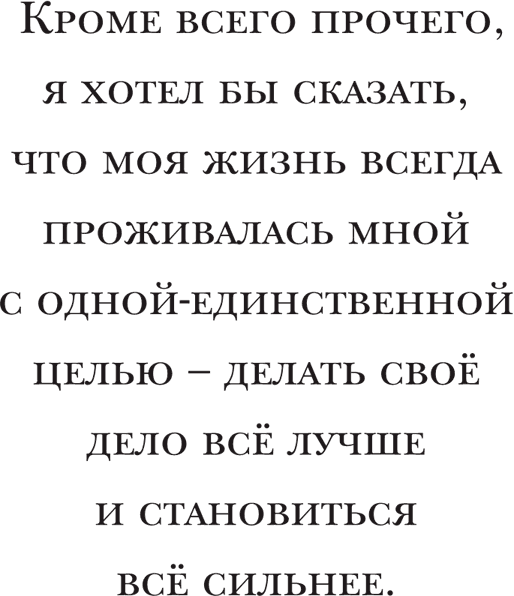 Кроме всего прочего, я хотел бы сказать, что моя жизнь всегда проживалась мной с одной-единственной целью – делать своё дело всё лучше и становиться всё сильнее. Ко всему, что я делал в своей жизни, я подходил именно так.