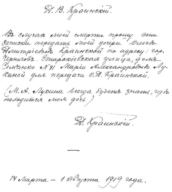 В случае моей смерти прошу эти записки передать моей дочери Ольге Дмитриевне Краинской по адресу: гор. Чернигов, Старокиевская улица, дом Семченко № 41, Марии Александровне Лукиной для передачи О. Д. Краинской.