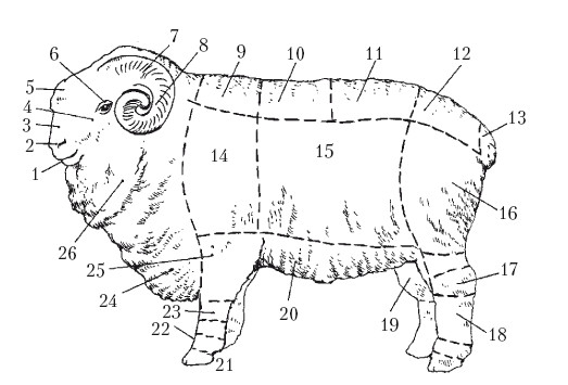 Стати овцы: 1 – рот; 2 – ноздри; 3 – морда; 4 – слезная ямка; 5 – лоб; 6 – глаза; 7 – рога; 8 – уши; 9 – холка; 10 – спина; 11 – поясница; 12 – крестец; 13 – хвост; 14 – лопатка; 15 – бок (ребра); 16 – окорок (ляжка); 17 – скакательный сустав; 18 – плюсна; 19 – мошонка; 20 – брюхо; 21 – копыта; 22 – бабка; 23 – запястье; 24 – соколок; 25 – плечо; 26 – шея