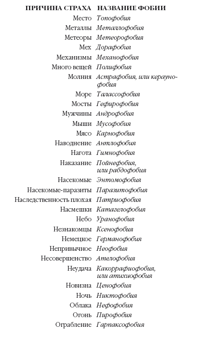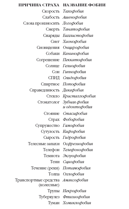 По последним подсчетам, существует около 267 фобий, и у каждой из них есть свое название[6]. Некоторые наиболее распространенные фобии взрослых таковы: страх открытых, людных мест (агорафобия), общества (социофобия), закрытых пространств (клаустрофобия), высоты (акрофобия), темноты (эклуофобия), молний (астрафобия), грома (бронтофобия, или кераунофобия), пауков (арахнофобия), змей (офидиофобия), крыс и мышей (роттефобия и мусофобия), полета (авиафобия) и стоматологических процедур (одонтофобия).