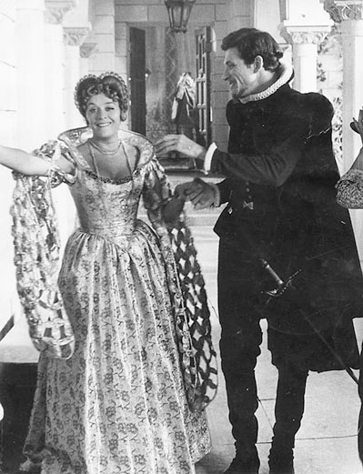 Расскажу интересную историю с избиением Теодоро. Когда он говорит Диане о своей любви к служанке Марселе, Диана, ревнуя, восклицает: «Мошенник! Дрянь! Я бы должна убить такого!» – и бьет его по лицу. Ян Фрид говорит мне: «Ударяй его легонько, едва касаясь». И Миша должен был отступать, прикрываясь еще и плащом. И тут началась борьба с режиссером. Я эту сцену видела совсем иначе. Ян Борисович был всегда такой изысканный, элегантно одетый, если бы я ему заранее начала высказывать свои предложения, он бы просто повернулся и ушел. Это можно было решить только на площадке. Я ему: «Как Вы себе это представляете? Мы же любовь, страсть, ревность настоящую играем!» А в это время зрители стоят и наблюдают за процессом. На мое великое счастье, сцену снимали в итальянском дворике, и всегда у нас там было очень много зрителей во время съемок. Я поворачиваюсь к ним, кричу: «Товарищи! Если мы играем настоящую любовь, бить я должна по-настоящему?» Они мне: «По-настоящему!!!»