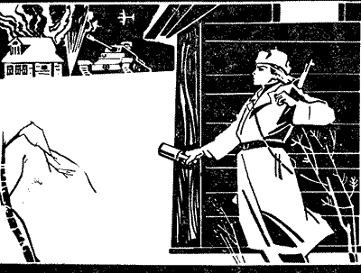 Семкин и его разведчики выбежали во двор, укрылись за углом избы. Пушка танка повернулась в их сторону. Из башни высунулся храбрый, видать, танкист в черном и крикнул:
