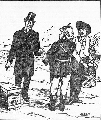 Министр колоний Джозеф Чемберлен спрашивает Сесиля Родса и Джона Буля, кто из них оплатит расходы по подавлению восстания ндебелов. Джон Буль — рядовой англичанин — возмущен. С него довольно и того, что приходится сражаться за Родса.