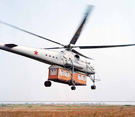 Ми-10 во время испытаний перевозит домик геолого-разведочной партии. 1960 г.