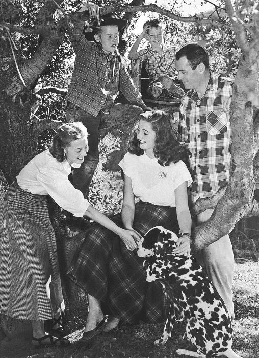 После войны. Мама, Пан, папа, Питер, я (в шляпе, на дереве) и наш далматин Базз. Это был мой любимый дуб, на который я чаще всего залезала.