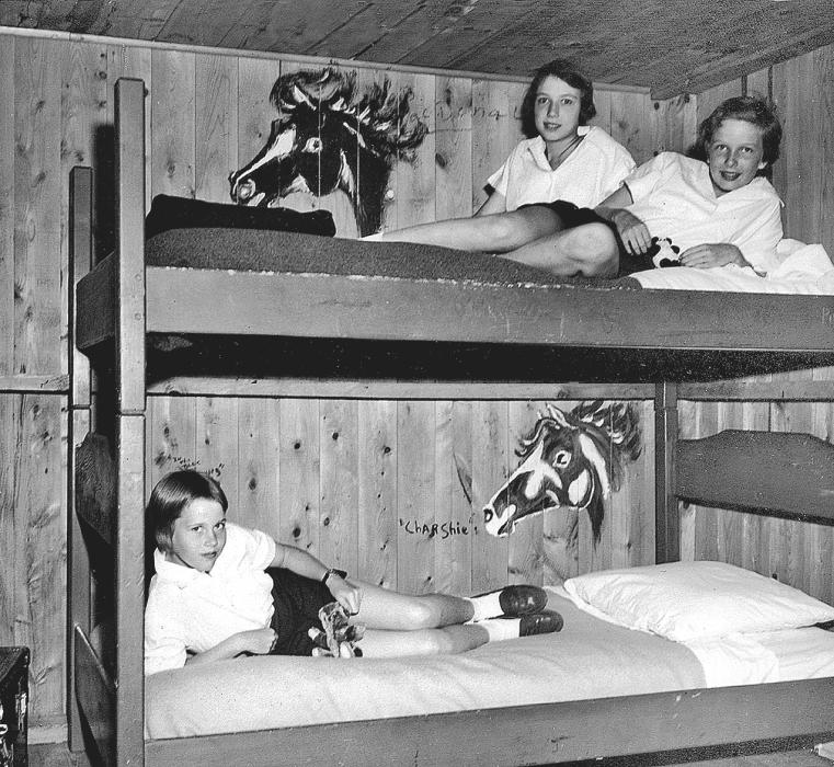 В летнем лагере после маминой смерти, с моими подружками Брук Хейуорд (на верхней кровати, впереди) и Сьюзен Тербелл. Лошадей нарисовали мы. 1950 г.