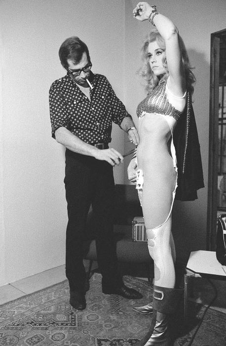 Вадим проверяет расположение разрывов на костюме Барбареллы. 1968 г.