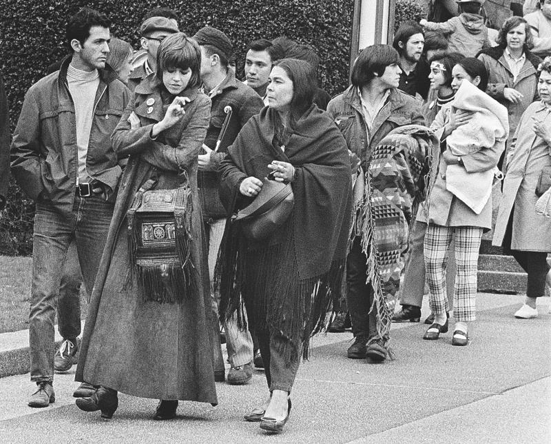 На марше с индейцами в Форт-Лоутоне, штат Вашингтон. Рядом со мной идет Джанет Маклауд. Сейчас меня впервые в жизни арестуют.