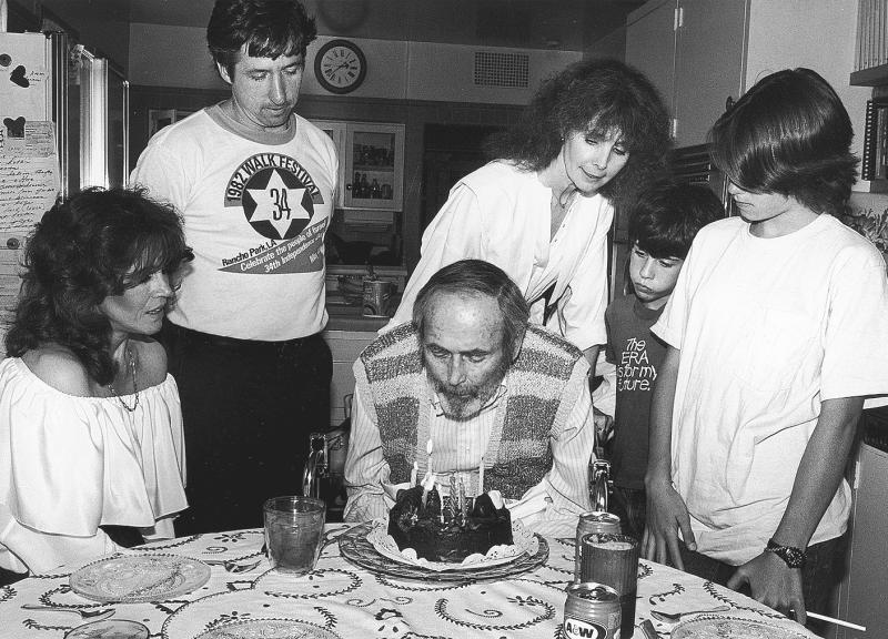 Папа задувает свечи в свой день рождения у себя дома – ему 77. Слева направо: я, Том, Шерли, Трой и Ванесса. 1982 г.