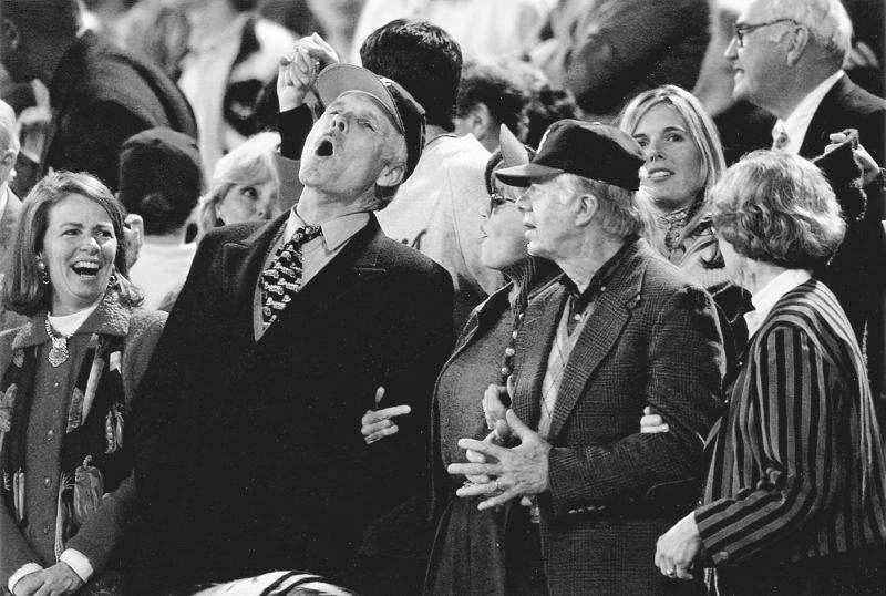 Тед вложил всю душу в песню “Старое доброе время” перед матчем с участием “Атланта Брейвз”. Слева направо: Нэнси Макгирк, Тед, я, президент Картер, Дженни Тернер и Розалин Картер.