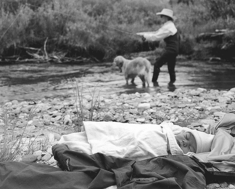 Рыбалка у Теда на ранчо “Флаинг Ди”. Рядом со мной Рокси, внук Малкольм спит на берегу. Жизнь прекрасна. 2000 г.