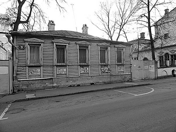 Этот одноэтажный домик с оборванными водосточными сливами, проржавевшей крышей с разваливающимися печными трубами сегодня выглядит архитектурным бомжом, случайно оказавшимся в заповеднике помпезного новостроя. В этом доме, построенном в 1834 году для некоей Емельяновой, во времена, когда Булгаков работал над своим романом, жили три его близких приятеля – братья Сергей и Владимир Топлянниковы (им принадлежал дом) и драматург Сергей Ермолинский. М. Булгаков постоянно заходил к своим друзьям. Больше того, часто в полуподвальной комнате, глядя на ноги прохожих, работал над текстом романа. Если сильно увлекался, забывая о времени, ему стучали щеткой в потолок. Случалось, что он тут же читал друзьям только что написанные страницы романа[12].