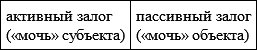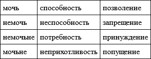 Существует множество других глаголов с разнообразными модальными оттенками, то есть включающими «мочь» в свое лексическое значение: «уполномочить», «предоставить», «отказать», «вынудить», «навязать», «избежать», «уклониться» и т. д., но все они в той или иной степени синонимичны указанным основным глаголам и распределяются по четырем пассивным модальностям: позволения – запрещения – принуждения – попущения. Общее для них – то, что предикаты «мочь», «не мочь», «не мочь не» и «мочь не» выступают как характеристики не субъекта, а объекта данного модального действия. Между модальностями активного и пассивного залога выстраивается такое соотношение:
