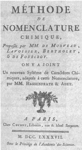 Доклады, представленные Лавуазье, Бертолле, Гитоном де Морво и Фуркруа в Академию наук, равно как и приложение дипломата и ученого Пьера Огюста Аде (1767- 1848) с новыми буквами и символами, были изданы одной книгой «Метод химической номенклатуры», которая была напечатана в Париже в 1787 году.