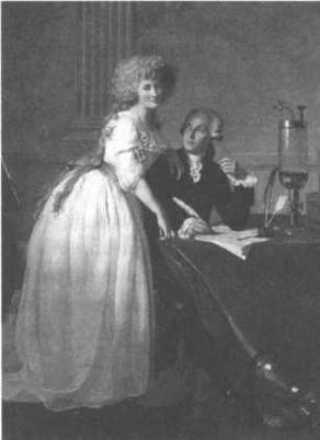 За год до революции Жак Луи Давид, который, как и Лавуазье, учился в колледже Мазарини, нарисовал картину, ставшую со временем самым верным свидетелем другой революции — в химии. Речь идет о портрете супругов Лавуазье в то время, когда они оба работали в лаборатории в Арсенале и когда Антуан готовился опубликовать«Элементарный курс химии». Лавуазье заплатил за картину невероятную сумму в 7000 ливров, которая равнялась зарплате за несколько лет многих специалистов того времени. Картина изображает пару в самом их расцвете — физическом, умственном и финансовом — и является единственным сохранившимся изображением ученого, не вызывающим сомнений. Хотя, бесспорно, главный герой картины — это Антуан, в центре полотна также изображена Мария, смотрящая прямо на зрителя. На столе и на полу видны превосходные стеклянные и металлические приборы, которые супружеская пара использовала во время своих опытов. История, рассказанная картиной, напоминает об уроках рисования, которые брала Мария у Давида и благодаря которым она стала автором точных гравюр к «Элементарному курсу химии». Черновики данного сочинения, возможно, находятся в коробке, нарисованной в правой части картины.