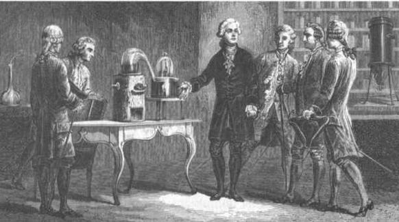 Гравюра 1874 года, на которой Лавуазье демонстрирует открытие кислорода. На втором плане можно видеть его калориметр. Из книги Луи Фигье «Жизнь блестящих ученых XVIII века·.