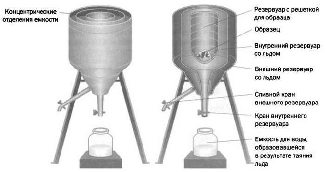 Ледяной калориметр Лавуазье состоит из трех концентрических отделений; в центральное помещается тело, теплоту которого нужно измерить. От этой теплоты тает лед, находящийся во втором отделении, а образовавшаяся в результате вода стекает в емкость, находящуюся внизу, для этого нужно открыть кран. Эта вода взвешивается с целью установления веса выделившейся теплоты. Во внешнее отделение кладется лед для теплоизоляции всей системы.