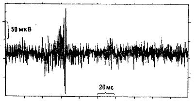 Рис. 10.10. Пульсирующая активность нейронов IMHV. Запись активности группы нейронов IMHV у наркотизированного цыпленка. По вертикальной оси отложены потенциалы, по горизонтальной — время. Можно видеть интенсивную фоновую активность с довольно низкой амплитудой и высокочастотный разряд с амплитудой до 300 микровольт. Такая пульсирующая активность резко усиливается после обучения.