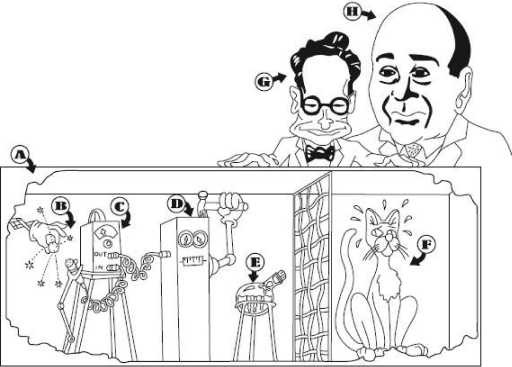 В закрытый ящик (А), содержащий баллон с ядовитым газом (Е), радиоактивный препарат (С) и радиационный детектор (D), помещен кот (F). Вероятность радиоактивного распада составляет ровно 50 % (В), если детектор фиксирует распад, механизм открывает баллон с газом, и кот умирает. Согласно квантовой теории, если над радиоактивным ядром не производится наблюдение, то оно описывается суперпозицией двух состояний — распавшегося и нераспавшегося. Следовательно, и состояние кота — полумертвое, если же ящик открыть, то экспериментатор, естественно, увидит конкретную ситуацию: ядро распалось, кот издох или ядро не распалось, кот жив. Сам Шрёдингер ставил вопрос так: когда система переходит из смешанного состояния в определенное? А поскольку мертвоживые коты не существуют, то и квантовая физика не до конца описывает объективную реальность, так что то же атомное ядро должно быть либо распавшимся, либо нет. (На карикатуре опыт ставят Шрёдингер (H) и Гейзенберг (G).)
