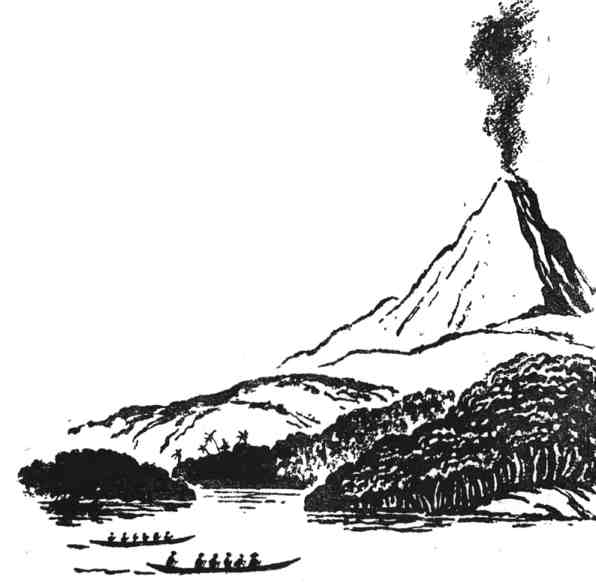 На острове виднелся вулкан, извергавший густой черный дым; ночью из жерла поднималось пламя.