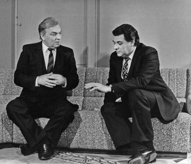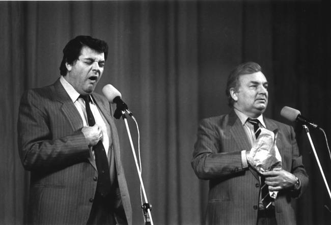 Страсть к «эстрадному» пребыванию родилась у нас с Михаилом Михайловичем с «капустников» еще в первом нашем совместном театре (а мы их вместе поменяли в своей жизни три, включая, надеюсь, последний — Театр сатиры), в Театре имени Ленинского комсомола, куда мы попали со студенческой скамьи и где прожили разную, но веселую и молодую актерскую жизнь. У нас с Мишей есть одна эстрадная зарисовка, которая сопутствует нам уже более тридцати лет и, как нам кажется, не стареет. Долгожительство ее предопределено формой. Державин (не владеющий, к сожалению, впрочем, как и я, ни одним зарубежным языком) имеет патологическую способность к имитированию мелодики разных иностранных языков на словесной абракадабре… Номер строится как интервью с приехавшим иностранным гостем со всеми нюансами советского перевода, где говорится явно одно, а переводится явно другое. Где гость говорит в течение двух-трех минут, а перевод звучит как «Здравствуйте, друзья!». Эта форма проверила себя десятилетиями и не стареет, ибо «резиновая». В каждой ситуации, в каждой аудитории, в каждый данный момент она наполняется сиюсекундным содержанием, что приводит публику в некое ошеломление. Действительно, приезжая на какой-нибудь провинциальный завод, мы до концерта расспрашиваем местных об острых проблемах производства, узнаем об одиозных фигурах данного предприятия, и когда на сцене «иностранец» говорит, что он потрясен женщинами номерного завода, после этого закатывает глаза и с вожделенным вздохом произносит: «О! Григорьева», а я «перевожу»: «Он без ума от Камзолкиной», — зал встает в едином порыве, ибо никак не может понять, откуда заезжие столичные артисты могут знать фамилии главного бухгалтера предприятия и начальника ВОХРы (военизированной охраны).