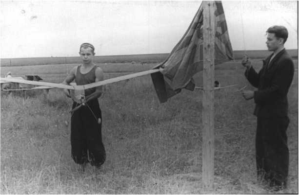 21. Подъем флага авиамодельных соревнований на аэродроме.