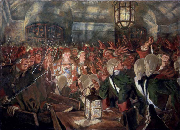 Царевна Елизавета Петровна и преображенцы в кордегардии Зимнего дворца в ночь на 25 ноября 1741 года. Художник Е. Е. Лансере.