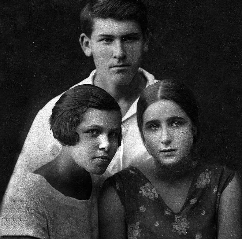 Тот же 1927 г. Справа – 17-летняя Лия. Рядом – ее лучшая подруга Таня, покончившая с собой через год, устыдившись арестованного отца-троцкиста. Юноша – Мирон Зандер, ухаживавший за бабушкой лет с пятнадцати. В тот же год он был арестован по обвинению в распространении троцкистской пропаганды вместе со своим одноклассником, моим будущим дедушкой Василием Гераскиным.