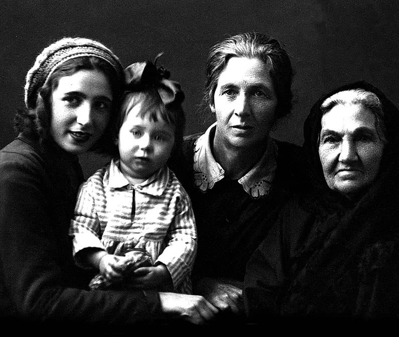 1931 г. Четыре поколения женщин моей семьи (справа налево): прапрабабушка Мина, прабабушка Маня, моя годовалая мама Алла и молодая бабушка Лия. Когда прапрабабушке Мине было 4 года, через маленькое еврейское местечко под Бердянском проходил цыганский табор. Пройдя, цыгане захватили кое-какое сушившееся во дворах белье, двух тощих лошаденок и игравшую на улице Мину. Семья была многодетная, за всеми не уследишь, и исчезновение Мины заметили лишь к вечеру. К тому времени табор ушел далеко. Через десять лет этот табор (а может, и какой другой) проходил через те же места. Родители Мины к тому времени умерли, но ее тетка узнала в цыганской девочке-подростке Мину и закричала на идиш: “Мина, Мина, это ты?!” Девочка ответила на ломаном идиш, что это она, и взволнованные евреи бросились на табор и отбили свою Мину у цыган. До сих пор не ясно, была ли это настоящая Мина или похожая на нее цыганская девочка, выучившая на идиш пару фраз. Так ли, этак ли, девочку водворили в семью тетки, а через год выдали замуж за вернувшегося после 25-летней службы в царской армии 41-летнего кантониста и хасида Боруха Бабкова. В свадебную ночь Мина – дикая, молчаливая, неласковая – повесилась в сарае. К счастью, Борух нашел свою маленькую жену вовремя, вынул из петли и уговорил жить. “Я тебя торопить не буду, – сказал Борух. – Поживем вместе, а когда ко мне привыкнешь, станем мужем и женой”. Судя по тому, что через год у них родился первый ребенок, а потом еще одиннадцать детей, Мина все-таки привыкла к своему мужу. И счастливо прожила с ним всю жизнь. Он был хасидский мудрец и колдун.