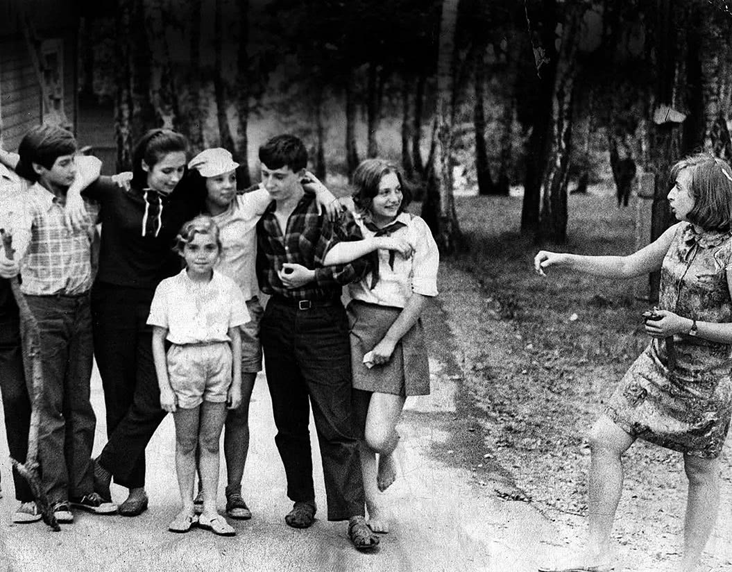 1971 г. Реписы не расстаются! В пионерском лагере родного Литфонда во Внукове. Нам с Аллой Гладилиной (первая справа, рядом со мною) уже тринадцать. Совсем большие. Но сердце мое в то время было отдано не ей, а Оле Корчагиной (вторая слева). Ах.