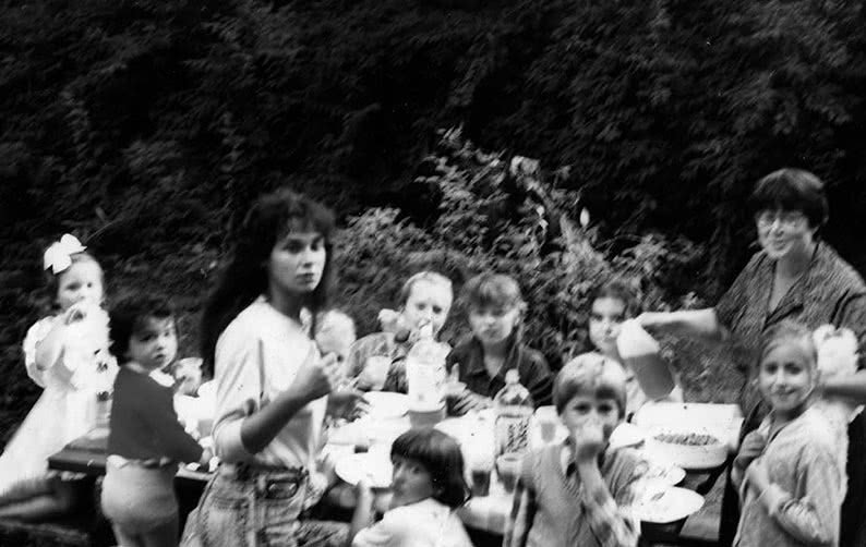 1988 г. Второе лето в Америке, Машин день рождения на даче в Катскильских горах. Маша – 4 года, крайняя слева (с бантом). Алёна (на переднем плане) и только три дня назад приехавшая в Нью-Йорк мама, выкрасившаяся в медно-рыжий цвет. Счастливое несоветское детство. Алёна уже ушла от меня, но мы остались друзьями. На всю жизнь.